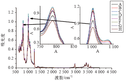 本文中红外光谱分析采用美国赛默飞世尔公司的Nicolet Is5型傅里叶变换红外光谱仪,应用全反射附件。全反射棱镜采由ZnSe晶体组成,测量光谱范围600〜4 000cm-1,分辨率采用4cm-1,每次测量中的扫描次数设置为32次。