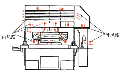 该电机采用空–空冷却系统,电机内部风路利用设置在转子两端的风叶将空气由两侧端盖抽入到机壳内,各自形成独立风路。每一条风路分为两条支路,一条支路通过转子风叶将空气送向绕组端部;另一条支路通过气隙将空气送入定子通风槽。两路气流汇合后经过电机上方的冷却器,将热量传递给外风路散发。