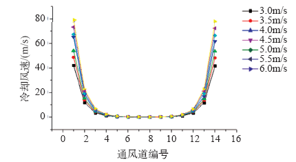 (4)随着冷却风速的增大,气隙通道内冷却气体流速逐渐增大,且增大趋势非常明显;靠近两端的通风道受到的影响比靠近中间的通风道要大。