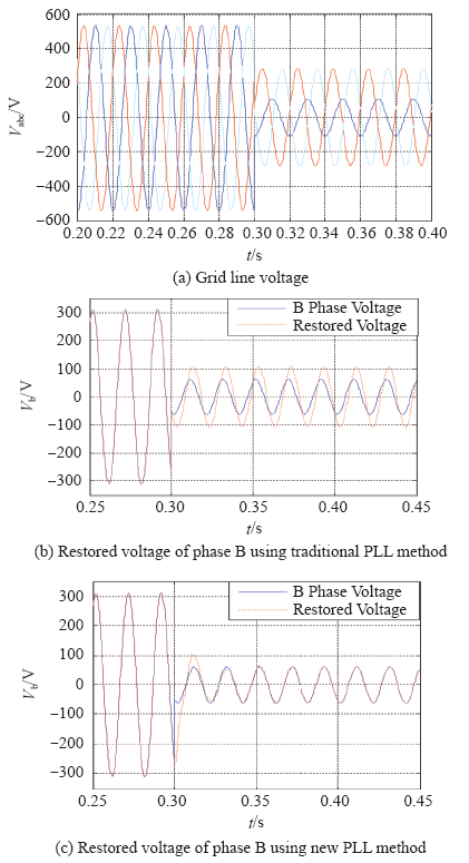 Fig.7 shows restored voltage of phase B using two different phase-locked loop method when grid voltage drops. The result of simulation indicates that in three-phase three-wire grid connected system, when voltage dip takes place, due to the offset of neutral point of three phase voltage, error exists in three-phase voltage of phase A, B, C that are sampled previously. Therefore, traditional three-phase imbalanced methods are unable to measure the amplitude and phase of the grid voltage precisely. By using new PLL method proposed in this article, we can measure and restore phase voltage of three-phase grid precisely. The effective voltage value of restored phase A is 175.51V, phase B and C are 43.88V. Compared with grid phase voltage that sags, the error is below 0.001%.
