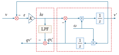 D(s) and Q(s) are secondary band pass filters. Judging from Fig.3, it can be seen that improved OSG-SOGI structure can eliminate the DC constituent of output signal v′ by negative feedback, meanwhile, and eliminate the DC constituent of output signal qv′ by adding a low pass filter.