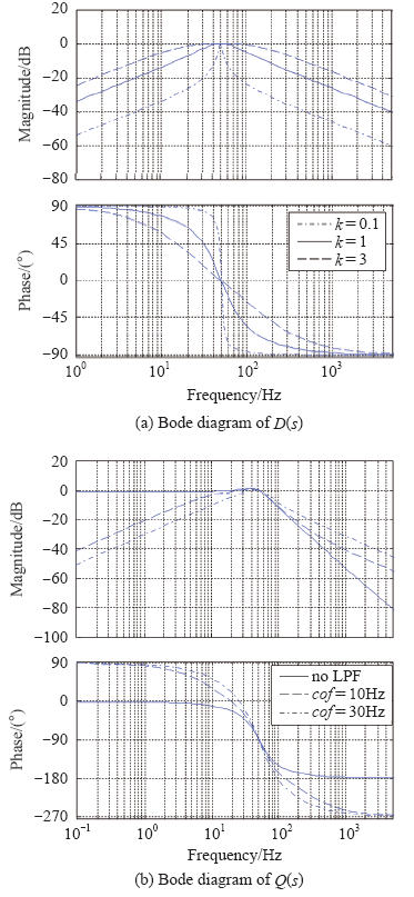 The transfer function is shown in Equ.(1) . D(s) and Q(s) respectively are closed-loop transfer functions corresponding to SOGI-QSG system; v is sine voltage signal input, v′ and qv′ have the same phase and amplitude; ω represents the resonance frequency of the SOGI and k respectively is the gain which affects the bandwidth of the OSG-SOGI structure. The Bode representations of D(s) and Q(s) , at different values of gain k, are showed in Fig.3.
