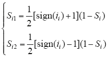 对于VIENNA型整流拓扑,当开关管关断时,开关侧所能实现的电位是由开关管所在相的电流方向决定的。当ii(i = a,b,c)流入a点时,sign(ii) = 1,当ii(i = a,b,c)流出a点时,sign(ii) = -1。针对双负载拓扑结构,为了数学模型有所简化,定义复合开关函数Si1、Si2(i = a、b、c)