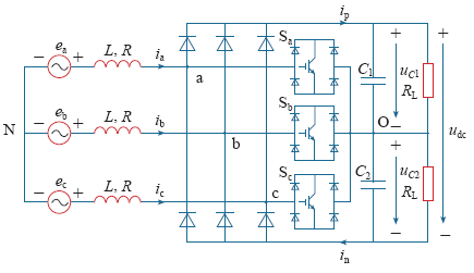 Si (i = a、b、c)为整流器开关函数,Si = 1时,功率开关管导通,Si = 0时,功率开关管关断。ea、eb、ec为电网三相交流电压;ia、ib、ic为电网三相交流电流;ip为整流器正向输出电流;in为整流器反向输出电流;R、L为滤波电抗器的电阻和电感;C为直流侧电容;uC1、uC2为直流侧电容输出电压。