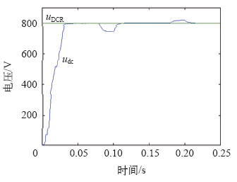 用 Matlab/Simulink 软件对系统进行仿真,参数设置如下:交流侧使用三相对称正弦电源,相电压220V、工频50Hz,电感参数为16mH、电阻0.3Ω,额定负载为两个等值电阻50Ω,调制频率5kHz,直流侧输出电压稳态期望值为800V,电容参数为2 200μF,由控制律可知,注入阻尼参数的大小ra与整流器的动态性能有很大的关系。当阻尼注入太小时系统反应较慢,直流侧输出电压稳定性能变差;当阻尼注入过大时,系统反应加快,但会导致输出电压有较大的超调量,图4为不同的阻尼注入时直流侧输出电压波形,经过仿真调试,选取500Ω较为合适。