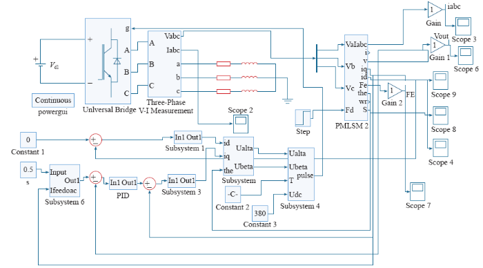 实验三过程中,在干扰情况下,进行了遗传算法和传统PID控制方法下的PMSLM对比仿真实验。其模型如图8所示。