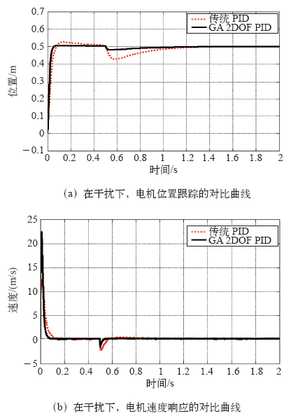 图9 在干扰下,电机位置跟踪和电机的速度响应对比曲线 |