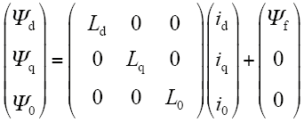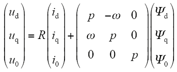 式中,ud、uq、u0为电机绕组端电压的d轴、q轴和零序分量;R为每相绕组的内阻;id、iq、i0为电机绕组电流的d轴、q轴和零序分量;p为微分算子;ω为旋转电角速度;Ψd、Ψq、Ψ0为电机磁链的d轴、q轴和零序分量,磁链方程的表达式为