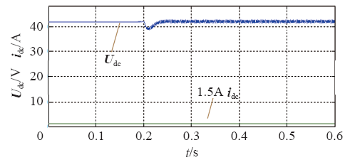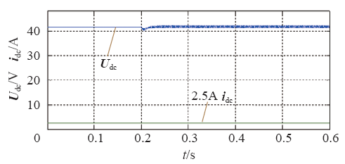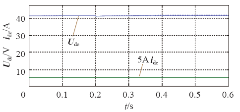 在这种故障状态下,只有一相绕组能进行发电输出,发电输出功率能力较小,此种情况下维持1.5A的负载运行,从图中可以看出,在发电故障状态之后,a相和b相绕组电流变为0,为输出相同的发电功率,c相电流的幅值增加,使负载侧电压恢复到42V,由于只有一相绕组输出发电功率,负载电压的波动幅值较大。