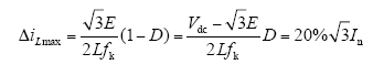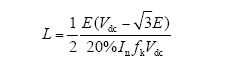 输出滤波电感大小影响电感电流的纹波,选择电感应使电流纹波一般小于额定电流的15%~20%,这里按三相L型逆变器设计滤波电感最小值,选取额定电流的20%。设逆变器额定输出相电压为Vin,额定输出相电流为In,电感电流纹波为ΔiLmax,逆变器直流输入母线电压为Vdc,电网相电压有效值为E,开关频率为fk,基波频率为fo。额定电流计算公式为