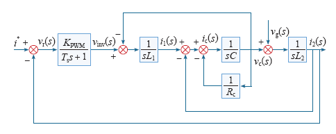 LCL 滤波器能够很好地满足谐波衰减的要求,但它是一个无阻尼三阶系统,容易发生谐振,在谐振频率处会有一个很高的谐振尖峰,一方面会导致大量谐波电流注入电网,另一方面谐振频率附近容抗高,对控制系统的相位影响较大,严重时可导致系统运行不稳定。对于小功率系统往往采用增加无源阻尼的方式,可以在LCL滤波器中的电容并联电阻,并入电阻的LCL滤波器控制框图如图4所示。