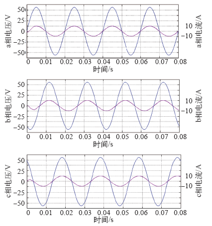 设置单级式LCL光伏并网系统仿真参数,模拟光伏电池经串并联组成光伏阵列组件,在光照强度1 000W/m2、温度25℃时,最大输出功率为1kW,最大功率点输出电压为100V,模拟交流电网电压55V,基波频率50Hz,逆变器开关频率20kHz,逆变器侧电感L1 = 2 400μH,网侧电感L2 = 600μH,滤波电容C = 10μF。