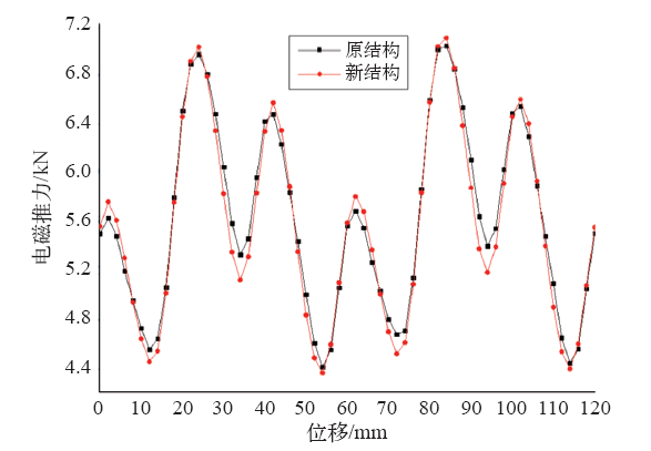 优化前后的电磁推力变化曲线如图7所示。两种结构的推力均值分别为5 569N和5 612N,推力波动分别为23.86%和22.89%,新结构与原结构相比,温度场性能得到了较大改善,电磁性能有所下降,同时电机体积有所减小,总体来说,该结构的改进是有益的。从它们的负载推力曲线中可以看出,它们的推力波动都比较大,这会导致电机运行不稳定,所以要对新结构的推力波动进行优化。