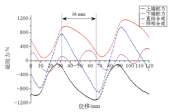 从图中可以看出,在动子的移动过程中下端部受到的力始终为正,上端部受到的力始终为负。当定子铁心长度是360mm(极距的整数倍)时上下端部力的走势几乎相同。如果让两条曲线错位约1/2个极距,则上下端的推力波动刚好能得到最大程度的抵消,整体端部力就会大大减小。即铁心总长度约为(n + 0.5)τ时,端部力最小。