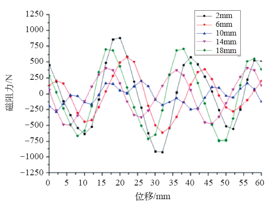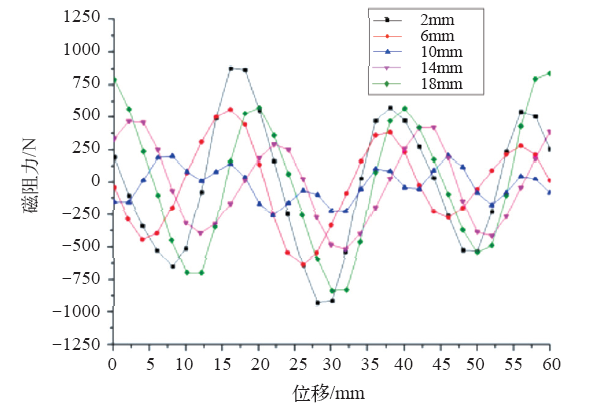 铁心错位的实质是让内外层齿槽力相位发生改变,针对双层气隙圆筒型永磁直线发电机的特殊结构,永磁体错位也可以得到同样的结果。让外层永磁体依次向上移动2mm、6mm、10mm、14mm和18mm,可得到发电机磁阻力的变化结果如图11所示。