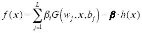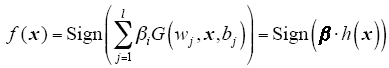 where, wj = [wj1,wj2,…,wjL]T and βj = [βj1, βj2, …,βjL]T are the weight vector connecting the j th hidden node with the input nodes and the output nodes, respectively, G(wj,x,bj) is the output of the j th hidden node and h(x) = [G(w1,x,b1), …,G(wL,x,bL)]T is the output vector of the hidden layer with respect to the input x, h(x) actually maps the data from the d-dimensional input space to the L-dimensional hidden layer feature space H. In Ref.[13] it is proved that the hidden layer weights and biases are randomly chosen and the output weights are analytically determined by finding the least-square solution in a SLFN. The NN is obtained after a few steps with very low computational cost and extremely fast learning speed. In Ref.[14-15] ELM was extended to the "generalized" SLFNs which may not be neuron alike.