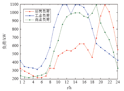 本文以IEEE标准33节点电力网络系统为例进行分析,接入的分布式电源包括WT、PV、MT(燃料为用秸秆制造的沼气)、FC和柴油发电机等多种分布式电源,其结构示意图及分布式电源接入位置如图1所示,节点电参数见表1,各分布式电源的参数见表2,温室气体排放参数见表3。本文配网系统中微型燃气轮机的燃料可以采用沼气,现在政府提倡不焚烧秸秆,农作物的秸秆保存下来可以用于生产沼气,用来给微型燃气轮机做燃料发电,这样既减少焚烧产生的颗粒物,减少“雾霾天气”,又可利用沼气发电,节约一次能源。因风电,光伏发电的不稳定性,在进行优化运算时,采用一般天气情况的经验值。PV、WT的日出力曲线如图2所示,配网中各种负荷的日曲线如图3所示。