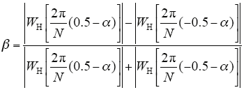 非同步采样时,f0为频率分辨率的非整数倍,此时采样值不是频谱峰线值。设频谱峰线附近采样到的最大和次最大谱线分别为第kp和kp+1条,kp≤k≤kp+1(kp+1 = kp + 1),两条谱线幅值分别为yp = |X(kpΔf)|和yp+1 = |X(kp+1Δf)|,引入参数α = k - kp - 0.5(0≤k - kp≤1),则-0.5≤α≤0.5;设β = (yp +1 - yp)/(yp +1 + yp ),由式(7)得