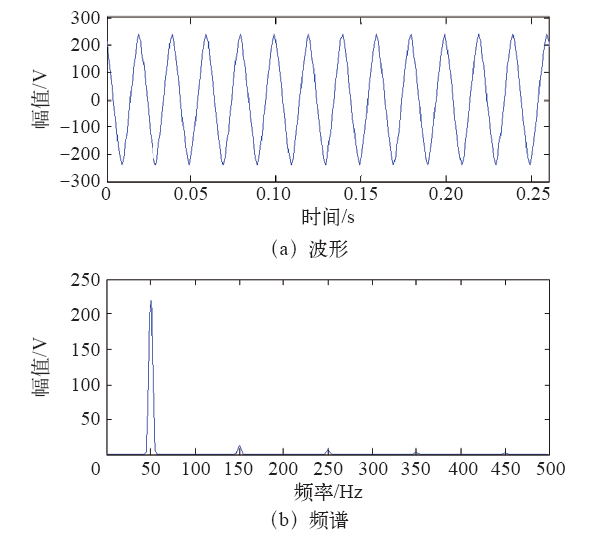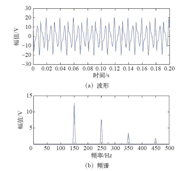 根据FFT算法对大幅值波形信号能够精确检测的特性,加改进余弦窗的双插值FFT算法可以精确地检测出基波频率的频谱,获得基波信号的频率、幅值和相位等参数。用原信号减去基波信号,再进行加窗插值FFT变换,较精确的获得3次、5次、7次和9次谐波的参数,所得信号波形及频谱如图6所示。