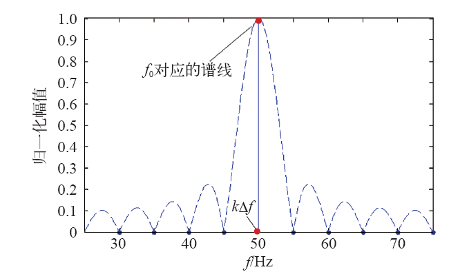 当f0为频率分辨率的整数倍,即同步采样时,同步采样频谱如图1所示,采样值为谱线峰值,此时没有频谱泄漏,X(kΔf ) = C0ejφ0/(2j),此时k为整数。同步采样可以准确计算信号的幅值、频率和相位参数。