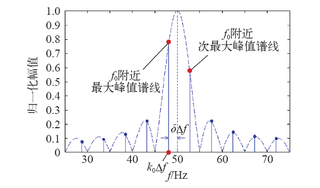 当f0为频率分辨率的非整数倍,即非同步采样时,非同步采样频谱如图2所示,由于非同步采样存在频谱泄漏,采样值不是谱线峰值,只能获得谱线峰值附近的幅值,此时k为非整数,令k = k0 + δ,0<δ<1,k0对应谱线峰值附近的最大峰值谱线的标号。