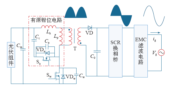 该系统结构可分为三部分:前级为光伏组件,为微逆变器提供稳定的直流侧电压;中间级可分为有源钳位电路和反激式高频变压器,其中有源钳位电路由漏感Lk、钳位电容Cc和N沟道的辅助MOSFET组成,主MOSFET同样选用N沟道;高频变压器匝比为1∶N,具有电气隔离和升压作用,可为后级提供可控而稳定的电流源;后级由SCR换相桥和EMC滤波电路组成,其中EMC滤波电路由C和L组成,主要用来对并入电网的电流进行高频滤波,提高并网电流的电能质量。