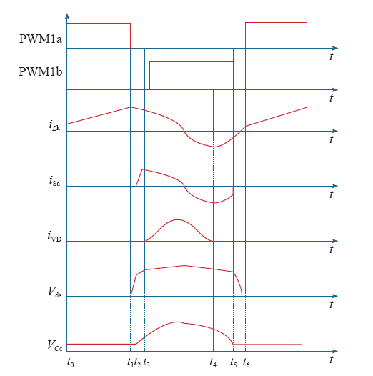 有源钳位反激变换器的关键波形如图2所示,PWM1a、PWM1b分别为主、辅助开关管Sw、Sa的驱动波,iLk、iSa、iVD分别为漏感电流、辅助开关管的谐振电流、反激输出电流,Vds、VCc分别为主开关漏源极电压、钳位电容两端电压。