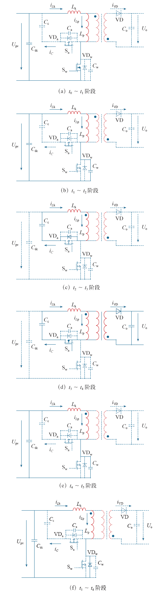 (1)t0~t1阶段:t0时刻Sw开通、Sa关断,一次电流线性上升,在励磁电感与漏感上存储能量。