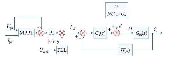基于有源钳位反激微逆变器的并网控制结构如图4所示。其控制策略主要含有电压外环、锁相环和电流内环三个部分。电压外环通过A/D采样光伏组件的电压和电流,经过MPPT控制和PI控制器得到给定并网电流基准值iref;锁相环PLL通过DSP的捕获寄存器对电网电压过零点进行检测,获得电网电压频率,产生与电网电压同频同相的单位正弦电流参考信号,同时也给SCR换相桥提供工频驱动信号;电流内环是整个控制系统的核心部分,控制并网电流准确地跟踪电流给定,优化系统动稳态性能,通过电流环对反激变压器一次侧开关管进行控制,得到输出电流信号is。Gc(s)为PI控制器传递函数,Gid(s)为微逆变器的传递函数,H(s)为电流检测电路的传递函数。