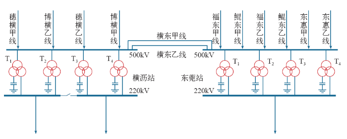 东莞电网中有220kV变电站共计27个,它们分别为:板桥变电站、大朗变电站、万江变电站、北栅变电站、莆心变电站,元江变电站、长安变电站、立新变电站、跃立变电站、古坑变电站、陈屋变电站、葵湖变电站、景湖变电站、下沙变电站、信垅变电站、白玉变电站、进埔变电站、寒溪变电站、步田变电站、黎贝变电站,则徐变电站、裕元变电站、七星变电站、彭洞变电站、培厚变电站、和美变电站、角布变电站。220kV主变压器台数共计为95。其中,板桥变电站110kV母线运行方式为“2 + 2”运行,即变压器T1与T3接同一组110kV母线,变压器T2与T4接另一组110kV母线;莆心变电站110kV母线运行方式为“1 + 3”运行,变压器T2单独接一组110kV母线,变压器T1、T3与T4接另一组110kV母线。