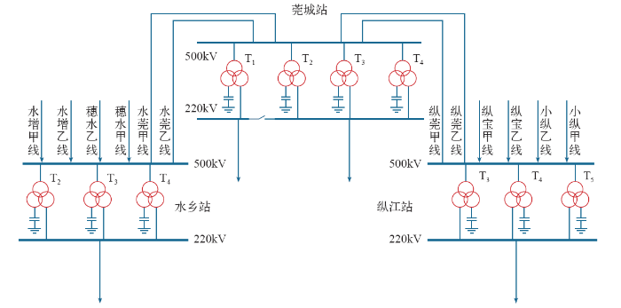 东莞电网中有500kV变电站共5个,它们分别为:东莞500kV变电站、横沥500kV变电站、莞城500kV变电站、水乡500kV变电站以及纵江500kV变电站。
