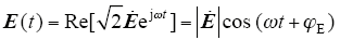 式中,以相量形式表征的各场量和源量均仅为空间坐标的函数,其模值为相应正弦量的有效值。例如,实际的时变电场E(t)可由电场复相量$\dot{E}$在时域表示为