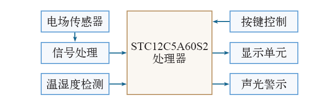 高压工频电场检测装置采用STC12C5A60S2系列单片机,该单片机内部集成了一个8路A–D转换器,由A–D转换器对反映工频电场强度大小的正弦电压信号进行采样。装置功能原理框图如图1所示。