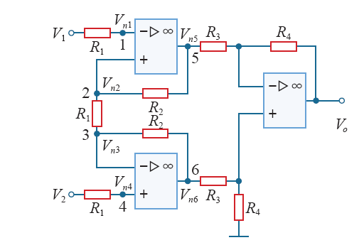 电场传感器即前述的工频电场检测元件将在工频电场感生出的电流信号做电压取样后输入到信号处理模块,由于输电线路发射能力很低下,因此检测元件感应出的电流或电压信号极为微小,因此要进行高倍率放大,同时还要进行工频检波处理,信号处理模块主要完成工频信号的放大和处理,输出到处理器进行采样和分析处理,其中高倍率的放大处理主要采用仪用差分放大电路,如图2所示,通过选取不同电阻的阻值,可完成放大倍数的设计。考虑到检测元件的感生电流经电压取样后的范围仅0~1mV,而STC12C5A60S2单片机的A–D转换的电压范围为0~5V,为提高A–D采样分析精度并经调试测算,本装置系统中采用的放大倍数设定为4 500倍。