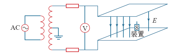 实验室中的实验原理如图3所示,借助于电场发生装置,上下极板采用2.0m×2.0m的镀锌钢板,极板间距1.2m,用于发生电场。将交流电两电极接到两大极板上使极板间产生均匀电场,利用通过变压器调节极板间的电场强度。
