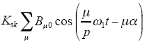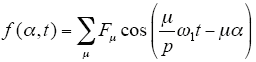 式中,μ为μ/p磁动势谐波的极对数,此处把电枢周长为2pτ的2极波作为基准波,则基波相当于p次波,令其为主波,则各次谐波的次数相应增加p倍,即谐波的次数等于其极对数,故μ也是磁动势谐波的次数;ω1为基波磁动势的角频率。由于爪极发电机磁极结构有对称性,因此谐波分量不含偶次谐波。经傅里叶分解可知,μ为奇数,μ = (2k + 1)p,k为整数。Fμ为考虑了爪极转子凸极影响的μ次谐波磁动势的幅值。