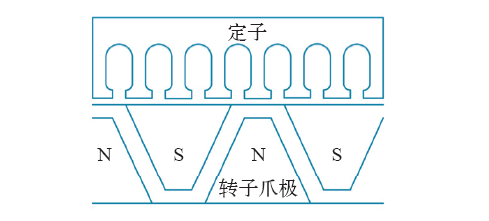 对于爪极发电机,其不仅仅是定、转子开槽。由于爪极转子的特性,应将转子视为开有斜槽。对于爪极发电机来说,由于爪极磁极在定子内圆上的投影为梯形,也就是说爪极转子斜槽是对称斜槽交错分布,如图1所示。