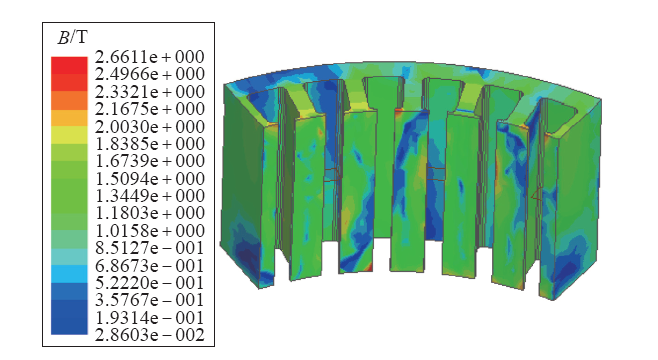 图2所示为爪极发电机定子的空载磁密云图,可以看到,由于爪极发电机转子磁极的特殊形状,发电机定子齿上的磁密产生了类似于斜槽的弱值区。