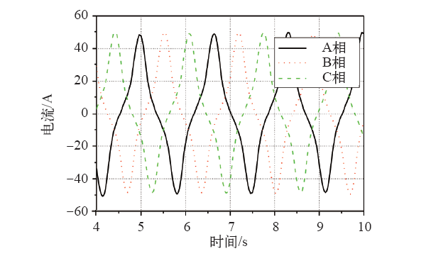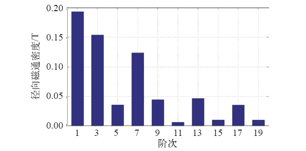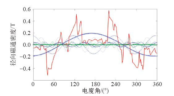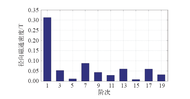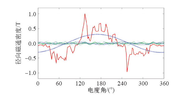 负载时的气隙磁场与空载下相比,基波幅值有所降低,低次谐波分量的幅值相对增大。负载下气隙磁密由于电枢反应,导致气隙磁密波形在最高峰处下降,整体波形也会产生畸变。