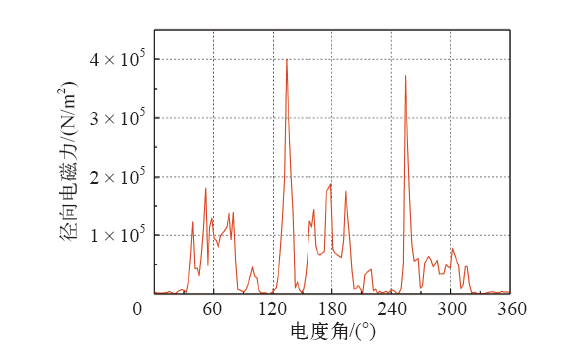 得到气隙磁场分布后,按照麦克斯韦应力张量法,即可得到径向电磁力的分布情况。图9所示为空载时的径向电磁力波的空间分布。可以看到,爪极投影覆盖下的定子齿上受到的径向电磁力较大,爪极磁极间空气隙处对应的径向电磁力幅值较小,其分布情况与气隙磁密的空间分布规律类似。