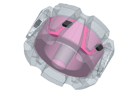 为减小爪极发电机转子极臂的离心颤动,可以采用爪极间焊铜加固的方式。在无刷爪极发电机中爪极发电机的两瓣爪盘就是通过铜块的焊接连接起来。由于铜不是磁性材料,所以可以利用焊接技术将铜焊在转子爪极之间,即将N、S磁极通过铜块连接起来,如图10所示。加铜焊后可以有效抑制爪极的径向离心颤动。采用铜焊时铜块的体积不宜过大,太大的铜块会增加转子质量,并提高成本;也不可过小,铜块太薄会使得焊接作用不明显,甚至有可能导致虚焊,在爪极发电机高速运转时有可能将焊接不牢的铜块甩出,导致不必要的故障及损失。正常的焊接铜块尺寸应是沿着转子周向能覆盖爪极磁极间距、轴向长度为10~15mm,径向厚度为5~8mm。本文采用的铜焊尺寸为径向厚度8mm,轴向长度为12mm。