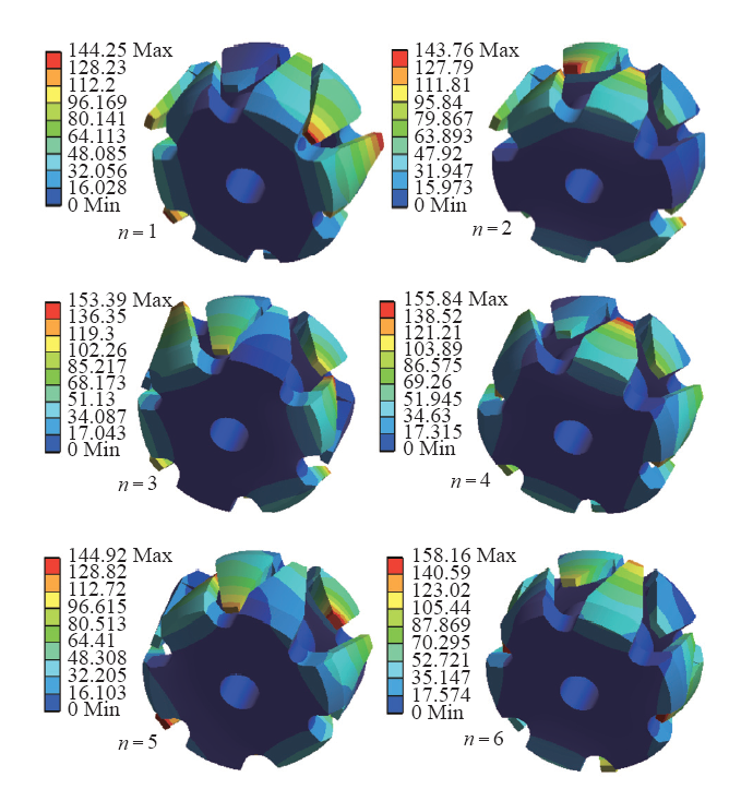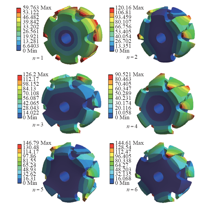前四阶的最大变形量显著下降,减小最多的是1阶模态,其变形量下降了58.6%。而转子的固有频率增大后,改变了转子固有频率和电磁力波频率的耦合特性,对于爪极转子高速旋转时的极尖变形有更好的抑制作用。