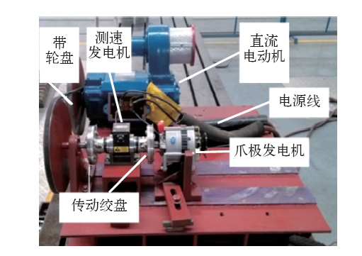 整个试验系统由电源系统、驱动部分、传动部分、样机、信号分析仪、振动传感器组成。根据试验系统设计的方案,结合工程实际,对各项设备与器材进行加工组装后,完成的试验系统如图14所示。图中,驱动部分为直流电动机,通过两个直径不同的皮带轮盘实现转换的转速,来带动爪极发电机的旋转;传动部分是由皮带轮通过铰链与爪极发电机的轴伸相连接,应用铰链连接可以充分减小驱动机以及皮带轮的振动对样机测试的影响;电源系统分别供给直流电动机的电源及励磁电流,以及爪极发电机的励磁电流;信号分析仪连接振动传感器,以分析振动信号。整个试验平台由刚性平台支撑。