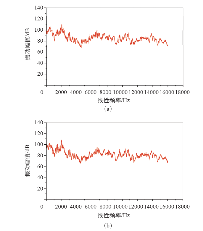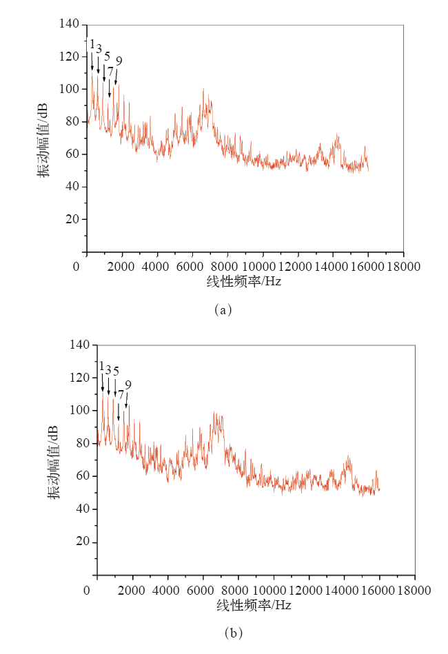 分析振动频谱图可知,普通爪极汽车发电机的主要阶次的振动幅值在91.4~110.3dB之间,分别对应不同主要阶次的振动频率。而高频区域的振动响应趋于平稳,对振动的影响较小。安装夹具对振动响应也有一定的影响,会降低某些高次谐波产生的振动。对铜焊连接的爪极发电机,振动响应试验结果如图16所示。