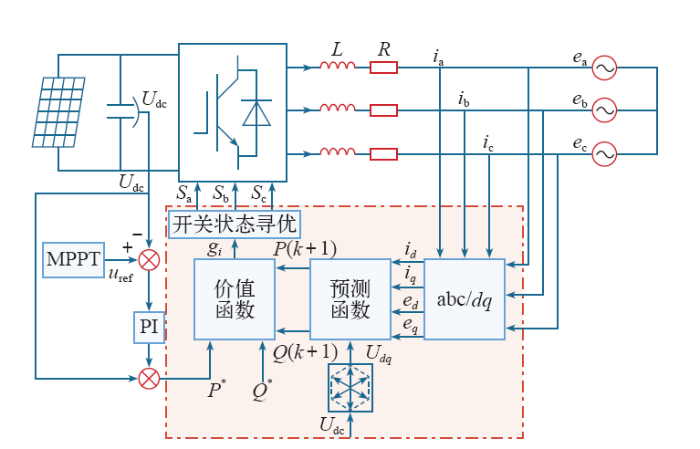 模型预测直接功率控制结构如图4所示。采集的电网电压ea、eb、ec和电流ia、ib、ic经过dq变换,转换成作为预测函数输入的直流量ed、eq和id、iq,电压矢量Udq通过直流电压Udc变换得到,预测函数输出的P(k + 1)、Q(k + 1)作为价值函数的输入,价值函数有功功率参考值P*通过MPPT得到,无功功率参考值Q*为给定值。通过价值函数去评估电压矢量,使价值函数最小的电压矢量将会应用到下一个采样周期,由此在开关状态寻优环节得到该电压矢量对应的开关状态Sa、Sb、Sc,从而控制开关管导通和关断。