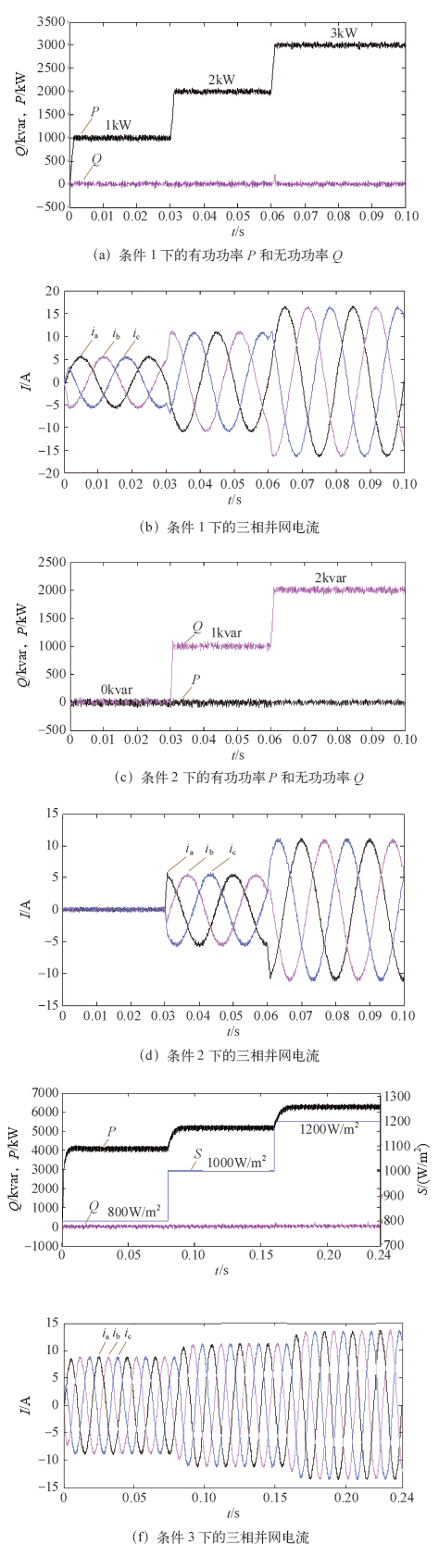 条件3:直流侧连接PV电池板,电池板选用SNM-P200型,连接方式为13串2并,额定功率为5kW。给定光照在0~0.08s时间内为800W/m2,0.08~0.16s时间内为1 000W/m2,0.16~0.24s时间内为1 200W/m2。根据图4所示的最大功率跟踪算法,有功功率参考值P*会跟随光照变化,为使逆变器工作在单位功率因数状态下,使无功功率参考值Q* = 0。其他参数保持不变,仿真结果如图6e、图6f所示,其中图6e为光照强度S变化和输出的有功功率P随光照变化的曲线及无功功率Q的波形,图6f为三相并网电流波形。图6e表明当光照强度发生突变时,实际的有功功率经过大约1.1ms实现最大有功功率输出。同时三相并网电流在光照强度发生突变时,也可以在给定功率跳变时刻快速跟随功率的变化。