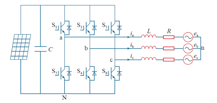 图1为单级式三相光伏并网逆变器,逆变器通过滤波电感L、线路电阻R与电网相连,根据基尔霍夫定律,得到系统在三相静止坐标系下的状态方程为