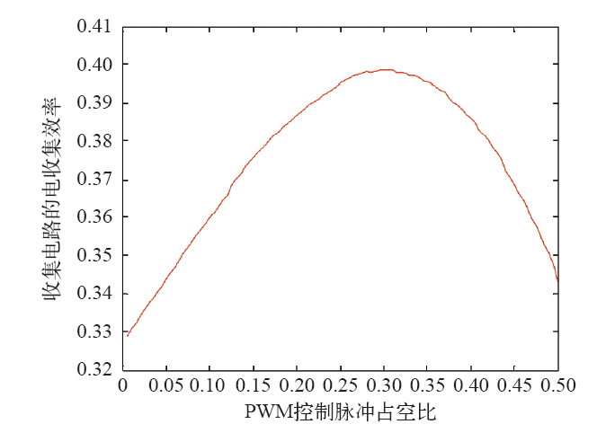图4为光伏电池处于Ui = 24V、Ri = 3Ω状态,以及收集电路等效输出负载Rfz = 50Ω时,收集电路受不同PWM脉冲占空比控制时的电收集效率情况。由图可见,收集电路的电收集效率存在最大值点,说明当收集电路中的元器件参数处于某个组合状态时,收集电路只有受控于某个对应的PWM控制脉冲占空比时才能使收集电路的电收集效率最高;另外,从图中还可见,收集电路的最大电收集效率比理想值0.5要低,这是因为收集电路中的电流采样电阻、单向隔离二极管等元器件要消耗一部分能量导致。