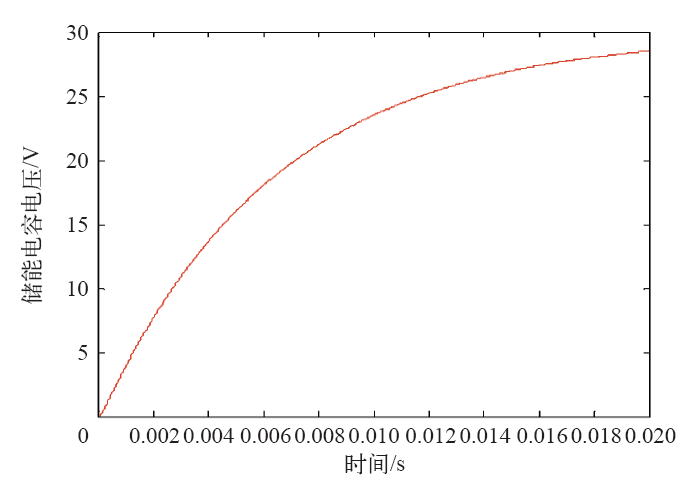 图7为收集电路运行过程中的储能电容电压变化情况,由图可见储能电容电压呈指数增加,且逐渐趋于一个稳定值,这是因为当储能电容电压低时,等效输出负载Rfz消耗的功率小,收集电路将一部分收集电能储存于储能电容,储能电容电压逐渐上升,等效输出负载Rfz消耗的功率也逐渐增加,当Rfz消耗的功率增加到与收集电路收集的功率相等时,储能电容的电压趋于稳定。