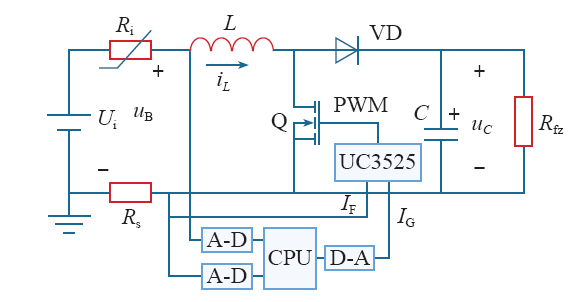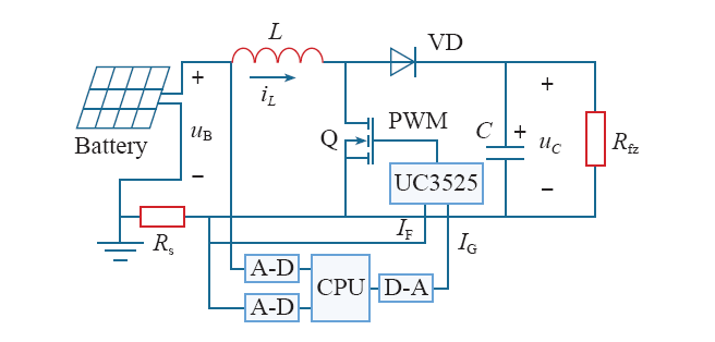 CPU逐开关周期地根据两路A-D的测量值,由式(6)计算出iMPPT,经D-A转换送给UC3525,作为Boost电路MPPT控制的电流给定值IG,即IG = IMPPT。光伏电池的实际输出电流在经A-D送入CPU的同时,也作为反馈信号经调理后作为IF送给专用控制芯片UC3525,UC3525根据电流误差值(IG - IF)经内置PID算法确定Boost电路的控制脉冲宽度,以迫使光伏电池实时输出电流值近似等于iMPPT。